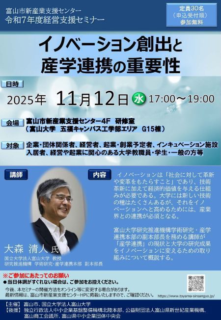 2025年11月12日に開催される「令和7年度経営支援セミナー」に、富山大学研究推進機構 学術研究・産学連携本部 大森 清人 副本部長が登壇します。皆様のご参加お待ちしております。▶申込はこちら