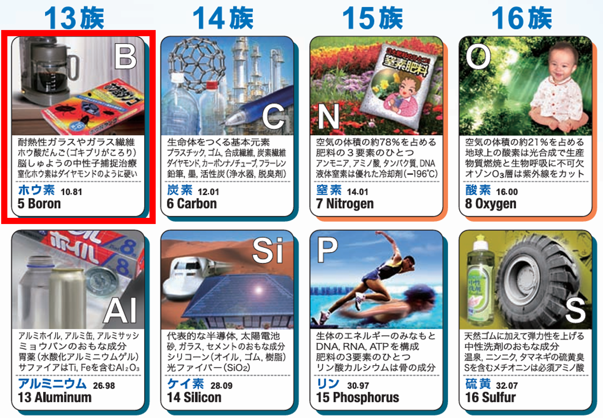 図1 周期表におけるホウ素の位置(文部科学省「一家に1枚 元素周期表(第13版)」より抜粋し、筆者にて一部改変)