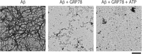 図2 アミロイドβ(Aβ)が分子シャペロンGRP78の存在下で凝集が抑制されることを観察した電子顕微鏡写真。GRP78は、エネルギー源であるATPがなくてもAβの凝集を抑制することから、細胞ストレス環境下でも同様の働きが期待できる。
