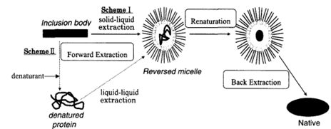 図1 変性タンパク質を逆ミセルで包み込み、その内部で修復を行う実験スキーム(出典:https://doi.org/10.1016/S1389-1723(00)89096-9)