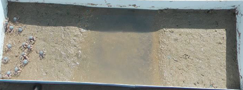 群れの研究は、前歩きをする珍しいカニの一種『ミナミコメツキガニ』を題材に始まりました。カニの群れの様子を観察・実験し、群れを再現するモデルの構築を試みました。