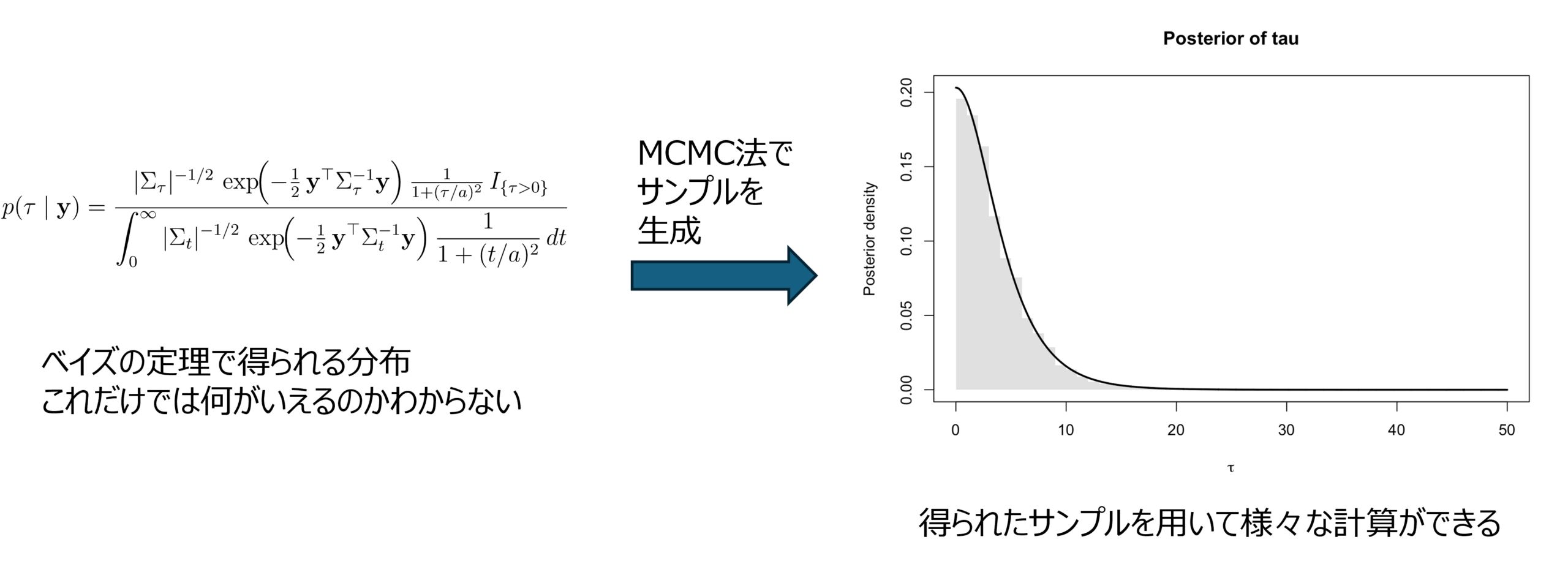 ベイズの定理で導かれる事後分布は、式として得られても複雑な形になることが多いため、平均や分散といった性質を理解するために、事後分布に従うサンプルを取り出すことができると便利です。しかし、複雑な分布から直接サンプルを得るのは簡単ではありません。