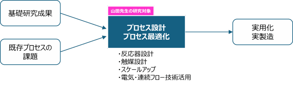 山田先生は、社会実装を見据えた、効率良く・無駄なく・環境に優しい製薬・合成プロセスを追求し、研究成果と社会を繋ぐための研究に取り組んでいます。