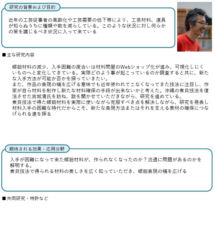 | 研究テーマ | 伝統工芸材料に関する調査 |