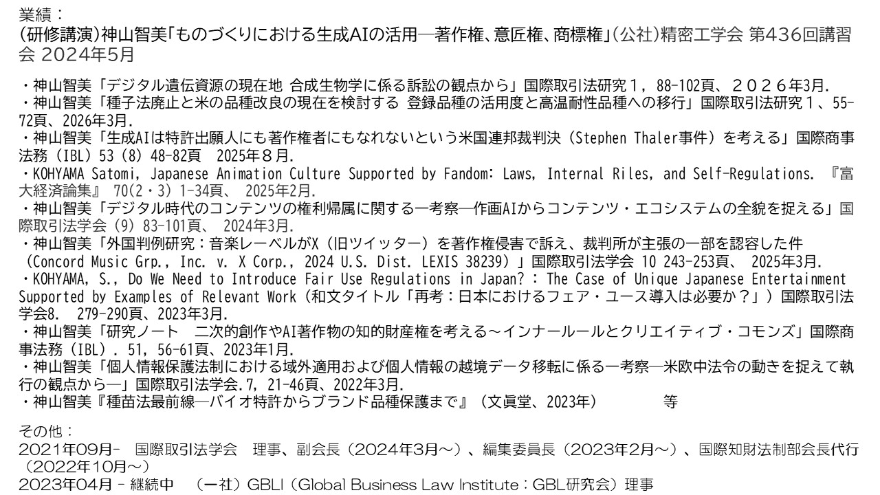 | キーワード | 農業知財、種苗法、デジタル著作物、、AI著作物、DSI(デジタル塩基配列情報) |