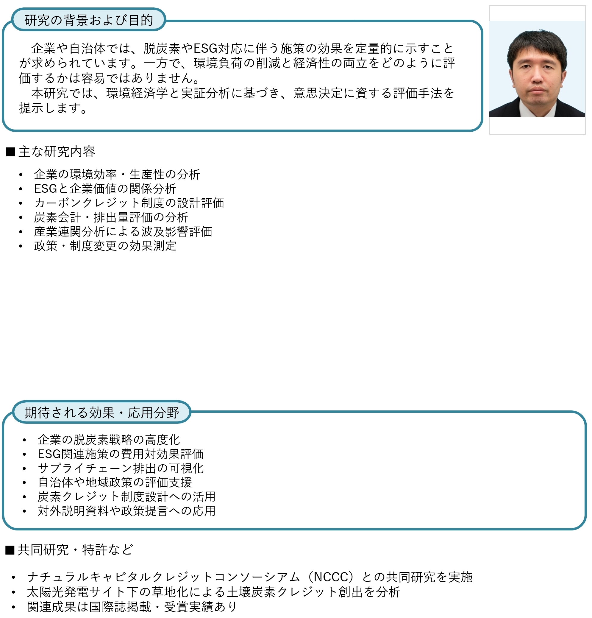 | 研究テーマ | 脱炭素・ESG経営の定量評価 |