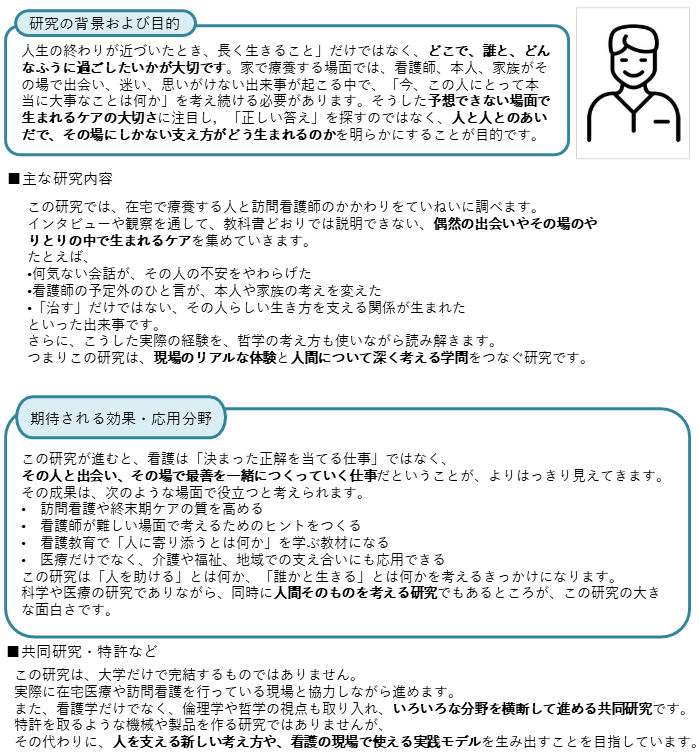| 研究テーマ | 偶然の出会いから生まれる在宅看護ケア |