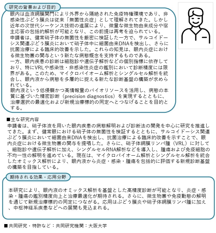 | 研究テーマ | 眼内サンプルを用いた診断方法の確立 |