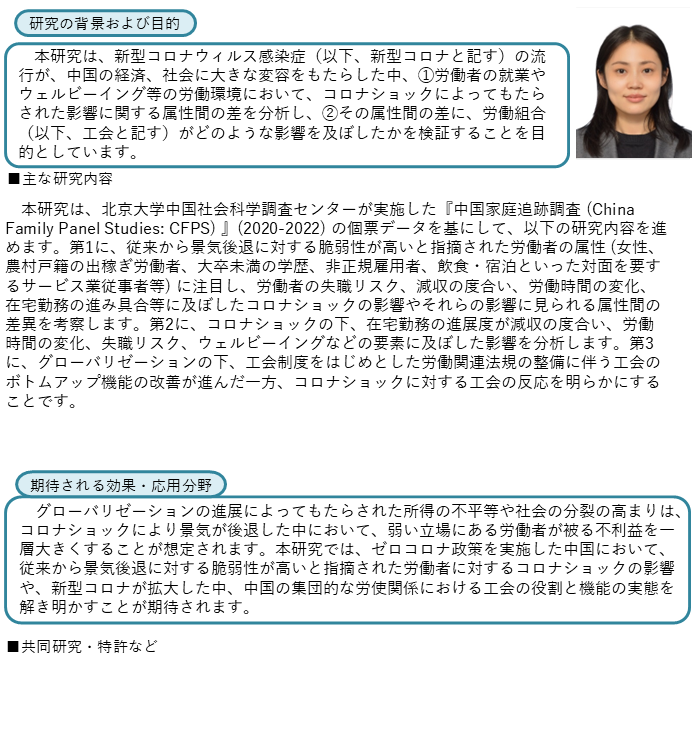 | 研究テーマ | コロナ禍における中国の労働環境の変化と工会の役割 |